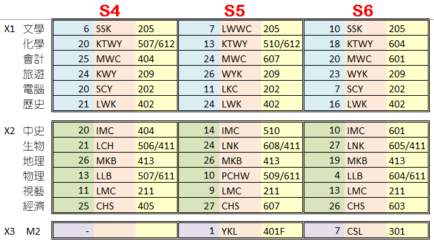 TD A 1 1A 英文 406 TD A 2 1A 英文 406 DY A 3 1A 中文 406 DY A 4 1A 中文 406 SCY A 5 1A 數學 406 SCY A 6 1A 數學 406 TD B 1 1A 英文 406 TD B 2 1A 英文 406 KCYY B 3 1A 家政 406/311 WYK B 3 1A 家政 406/311 KCYY B 4 1A 家政 406/311 WYK B 4 1A 家政 406/311 MKB B 5 1A 地理 406/414 MKB B 6 1A 地理 406/414 DY B 7 1A 中文 406 DY B 8 1A 中文 406 DY C 1 1A 中文 406 LTHS C 2 1A 科學 406 CNN C 3 1A 普通 406 TD C 4 1A 英文 302/406 LLMF C 5 1A 音樂 406/213 LLMF C 6 1A 音樂 406/213 WYYS C 7 1A 體育 PGND YYW C 7 1A 體育 PGND WYYS C 8 1A 體育 PGND YYW C 8 1A 體育 PGND TD D 1 1A 英文 406 TD D 2 1A 英文 406 SCY D 3 1A 數學 406 SCY D 4 1A 數學 406 HFC D 5 1A 歷史 406 HFC D 6 1A 歷史 406 LTHS D 7 1A 科學 406/511 LTHS D 8 1A 科學 406/511 DY E 1 1A 中文 406 DY E 2 1A 中文 406 KCKP E 3 1A 通識 406 KCKP E 4 1A 通識 406 TD E 5 1A 英文 406 TD E 6 1A 英文 406 SCY E 7 1A 數學 406 SCY E 8 1A 數學 406 CTHS F 1 1A 視藝 211 CTHS F 2 1A 視藝 211 LKC F 3 1A 電腦 209/202 LLMF F 3 1A 電腦 209/202 HWLW F 4 1A 宗教 406 YLW F 5 1A 中史 406 YLW F 6 1A 中史 406 LTHS F 7 1A 科學 406/511 LTHS F 8 1A 科學 406/511 LLMF A 1 1B 音樂 407/213 LLMF A 2 1B 音樂 407/213 LNL A 3 1B 中文 407 LNL A 4 1B 中文 407 KCYY A 5 1B 家政 407/311 WYK A 5 1B 家政 407/311 KCYY A 6 1B 家政 407/311 WYK A 6 1B 家政 407/311 LTHS B 1 1B 科學 407/511 LTHS B 2 1B 科學 407/511 MKB B 3 1B 地理 407/414 MKB B 4 1B 地理 407/414 CMF B 5 1B 數學 407 WMK B 5 1B 數學 407 CMF B 6 1B 數學 407 WMK B 6 1B 數學 407 TD B 7 1B 英文 407 TD B 8 1B 英文 407 LNL C 1 1B 中文 407 TD C 2 1B 英文 302/407 KCKP C 3 1B 中史 407 KCKP C 4 1B 中史 407 WYYS C 5 1B 體育 PGND YYW C 5 1B 體育 PGND WYYS C 6 1B 體育 PGND YYW C 6 1B 體育 PGND LTHS C 7 1B 科學 407/511 LTHS C 8 1B 科學 407/511 LNL D 1 1B 中文 407 LNL D 2 1B 中文 407 TD D 3 1B 英文 407 TD D 4 1B 英文 407 WMK D 5 1B 數學 407 WMK D 6 1B 數學 407 HFC D 7 1B 歷史 407 HFC D 8 1B 歷史 407 CTHS E 1 1B 視藝 211 CTHS E 2 1B 視藝 211 CHS E 3 1B 通識 407/303 CHS E 4 1B 通識 407/303 LKC E 5 1B 電腦 209/202 WMK E 5 1B 電腦 209/202 LTHS E 6 1B 科學 407 TD E 7 1B 英文 407 TD E 8 1B 英文 407 CNN F 1 1B 普通 407 LG F 2 1B 宗教 407 LNL F 3 1B 中文 407 LNL F 4 1B 中文 407 TD F 5 1B 英文 407 TD F 6 1B 英文 407 WMK F 7 1B 數學 407 WMK F 8 1B 數學 407 KCYY A 1 1C 家政 408/311 WYK A 1 1C 家政 408/311 KCYY A 2 1C 家政 408/311 WYK A 2 1C 家政 408/311 LMC A 3 1C 視藝 211 LMC A 4 1C 視藝 211 LG A 5 1C 宗教 408 HBJ A 6 1C 英文 401F LLCN A 6 1C 英文 408 TD A 6 1C 英文 408 KKL B 1 1C 通識 408 KKL B 2 1C 通識 408 DY B 3 1C 中文 408 DY B 4 1C 中文 408 IMC B 5 1C 中史 408 IMC B 6 1C 中史 408 HBJ B 7 1C 英文 401F LLCN B 7 1C 英文 302/408 TYM B 7 1C 英文 302/408 HBJ B 8 1C 英文 401F LLCN B 8 1C 英文 302/408 TYM B 8 1C 英文 302/408 HBJ C 1 1C 英文 401F LLCN C 1 1C 英文 302/408 TYM C 1 1C 英文 302/408 DY C 2 1C 中文 408 PCHW C 3 1C 數學 408 WMK C 3 1C 數學 401F PCHW C 4 1C 數學 408 WMK C 4 1C 數學 401F WYYS C 5 1C 體育 PGND YYW C 5 1C 體育 PGND WYYS C 6 1C 體育 PGND YYW C 6 1C 體育 PGND HFC C 7 1C 歷史 408 HFC C 8 1C 歷史 408 LLMF D 1 1C 音樂 408/213 LLMF D 2 1C 音樂 408/213 PCHW D 3 1C 數學 408 WMK D 3 1C 數學 401F PCHW D 4 1C 數學 408 WMK D 4 1C 數學 401F DY D 5 1C 中文 408 DY D 6 1C 中文 408 HBJ D 7 1C 英文 401F LLCN D 7 1C 英文 408 HBJ D 8 1C 英文 401F LLCN D 8 1C 英文 408 LCH E 1 1C 科學 511 LCH E 2 1C 科學 511 MKB E 3 1C 地理 408/414 MKB E 4 1C 地理 408/414 CNN E 5 1C 普通 408 LKC E 6 1C 電腦 209/202 LLMF E 6 1C 電腦 209/202 HBJ E 7 1C 英文 401F LLCN E 7 1C 英文 408 HBJ E 8 1C 英文 401F LLCN E 8 1C 英文 408 PCHW F 1 1C 數學 408 WMK F 1 1C 數學 401F PCHW F 2 1C 數學 408 WMK F 2 1C 數學 401F LCH F 3 1C 科學 511 LCH F 4 1C 科學 511 DY F 5 1C 中文 408 DY F 6 1C 中文 408 HBJ F 7 1C 英文 401F LLCN F 7 1C 英文 408 TD F 7 1C 英文 408 HBJ F 8 1C 英文 401F LLCN F 8 1C 英文 408 TD F 8 1C 英文 408 MKB A 1 1D 地理 409/414 MKB A 2 1D 地理 409/414 CHS A 3 1D 通識 409/303 CHS A 4 1D 通識 409/303 LKC A 5 1D 電腦 209/202 WMK A 5 1D 電腦 209/202 HBJ A 6 1D 英文 401F KLYK A 6 1D 英文 409 LG B 1 1D 宗教 409 CNN B 2 1D 普通 409 LMC B 3 1D 視藝 211 LMC B 4 1D 視藝 211 KCYY B 5 1D 家政 409/311 WYK B 5 1D 家政 409/311 KCYY B 6 1D 家政 409/311 WYK B 6 1D 家政 409/311 HBJ B 7 1D 英文 401F KLYK B 7 1D 英文 409 HBJ B 8 1D 英文 401F KLYK B 8 1D 英文 409 HBJ C 1 1D 英文 401F KLYK C 1 1D 英文 409 CNN C 2 1D 中文 409 CTHS C 2 1D 中文 409 LCF C 3 1D 數學 409 WYYS C 3 1D 數學 409 LCF C 4 1D 數學 409 WYYS C 4 1D 數學 409 KSS C 5 1D 科學 511 KSS C 6 1D 科學 511 WYYS C 7 1D 體育 PGND YYW C 7 1D 體育 PGND WYYS C 8 1D 體育 PGND YYW C 8 1D 體育 PGND KSS D 1 1D 科學 511 KSS D 2 1D 科學 511 LLMF D 3 1D 音樂 409/213 LLMF D 4 1D 音樂 409/213 CNN D 5 1D 中文 409 CTHS D 5 1D 中文 409 CNN D 6 1D 中文 409 CTHS D 6 1D 中文 409 HBJ D 7 1D 英文 401F KLYK D 7 1D 英文 409 HBJ D 8 1D 英文 401F KLYK D 8 1D 英文 409 WYYS E 1 1D 數學 409 WYYS E 2 1D 數學 409 CNN E 3 1D 中文 409 CTHS E 3 1D 中文 409 CNN E 4 1D 中文 409 CTHS E 4 1D 中文 409 YLW E 5 1D 中史 409 YLW E 6 1D 中史 409 HBJ E 7 1D 英文 401F KLYK E 7 1D 英文 409 HBJ E 8 1D 英文 401F KLYK E 8 1D 英文 409 WYYS F 1 1D 數學 409 WYYS F 2 1D 數學 409 CNN F 3 1D 中文 409 CTHS F 3 1D 中文 409 CNN F 4 1D 中文 409 CTHS F 4 1D 中文 409 HFC F 5 1D 歷史 409 HFC F 6 1D 歷史 409 HBJ F 7 1D 英文 401F KLYK F 7 1D 英文 409 HBJ F 8 1D 英文 401F KLYK F 8 1D 英文 409 WMK A 1 2A 數學 204 WYYS A 1 2A 數學 301 WMK A 2 2A 數學 204 WYYS A 2 2A 數學 301 KCC A 3 2A 中文 204 KCC A 4 2A 中文 204 LMC A 5 2A 視藝 211 LMC A 6 2A 視藝 211 KWY B 1 2A 通識 204/303 KWY B 2 2A 通識 204/303 WMK B 3 
