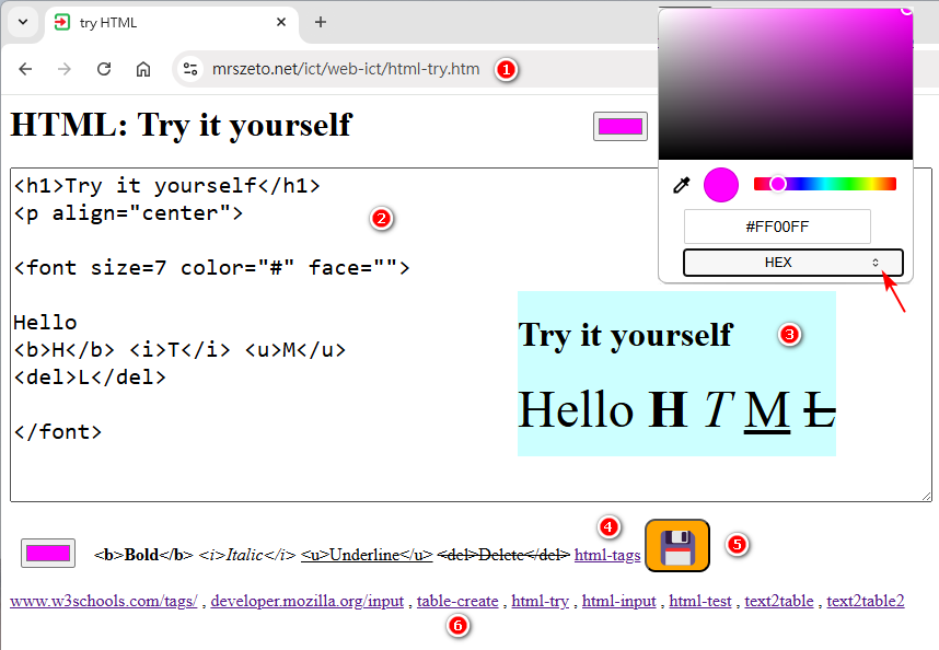1. https://mrszeto.me/ict/web-ict/html-try.htm 2. 可改變HTML代碼, 3. 若代碼正確,結果會立即顯示。 4. 參考:html-tags.pdf 5. 按鍵存檔(download/try-it-yourself.htm)。 6. 幫助製作 HTML Table (colspan, rowspan, ...)