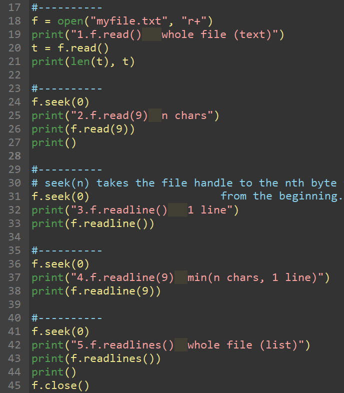 f.read( ) whole file (text) f.read(n) n chars f.readline() 1 line f.readline(n) min(n chars, 1 line) f.readlines() whole file (list)